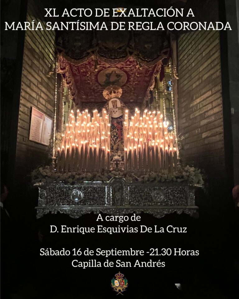 Hoy sábado 16 de Septiembre a las 21:30 horas, tendrá lugar la XL Exaltación a María Santísima de Regla Coronada 2023. El acto correrá cargo