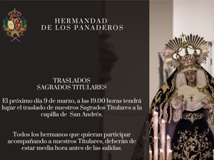 El próximo día 9 de marzo, a las 19.00 horas tendrá lugar el traslado de nuestros Sagrados Titulares a la capilla de San Andrés. Todos