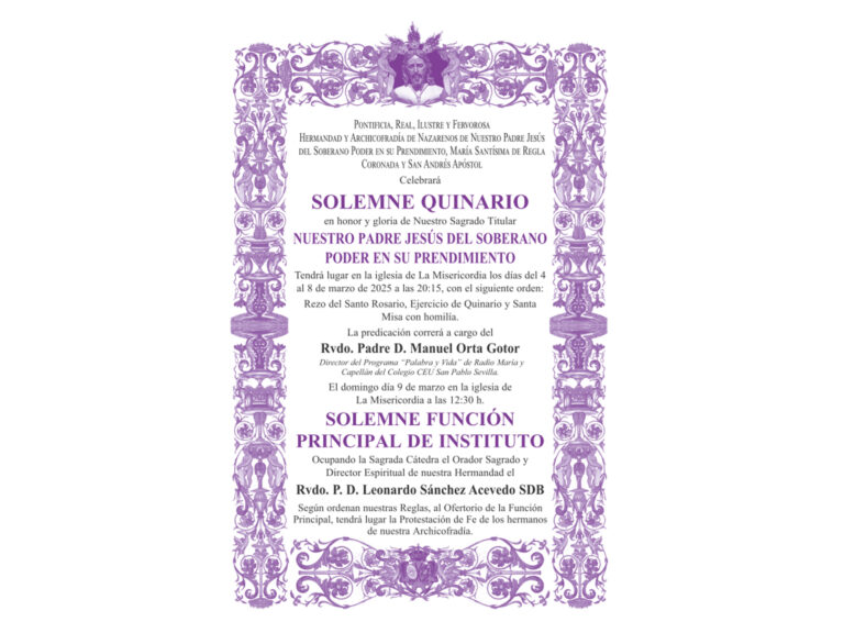 SOLEMNE QUINARIO en honor y gloria de Nuestro Sagrado Titular NUESTRO PADRE JESÚS DEL SOBERANO PODER EN SU PRENDIMIENTO. Tendrá lugar en la iglesia de
